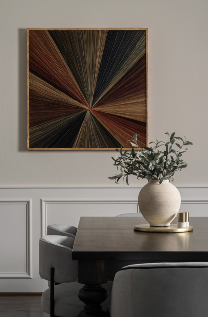 A dining room with a single striking artwork can feel more personal than a gallery wall of pieces