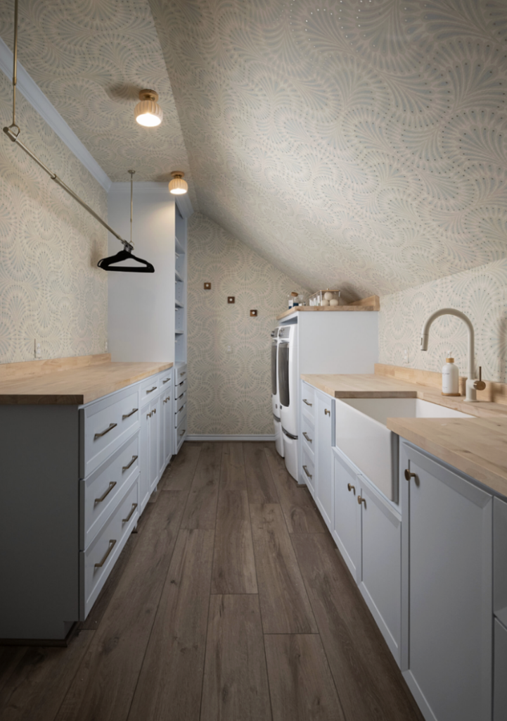A laundry space wrapped in one beautiful pattern feels intentional rather than utilitarian. A
